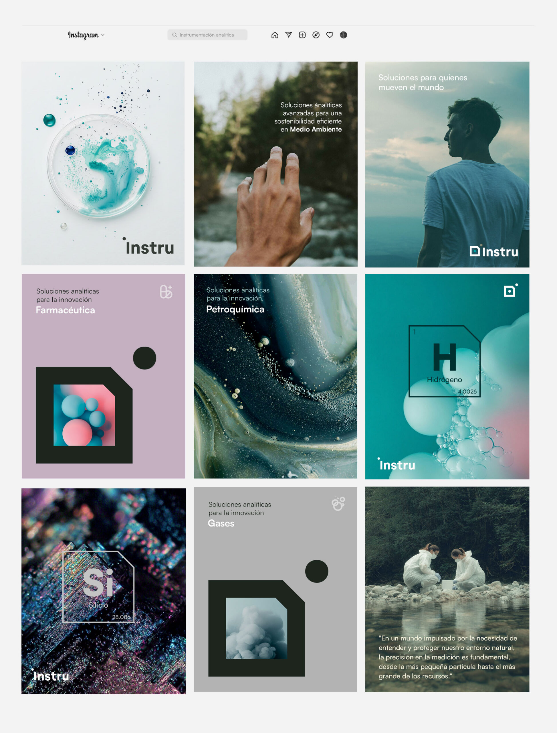 Instru vende, distribuye, calibra y mantiene instrumentación de análisis para sectores como farmacia, medioambiente, petroquímica, química, gases, agroalimentario y energía. Mi trabajo consistió en definir la estrategia de marca (Brand Essence) y transformar su identidad visual —de Instrumentación Analítica a INSTRU— en un sistema claro, técnico y cercano que pudiera escalar en comunicación, comercial y digital.