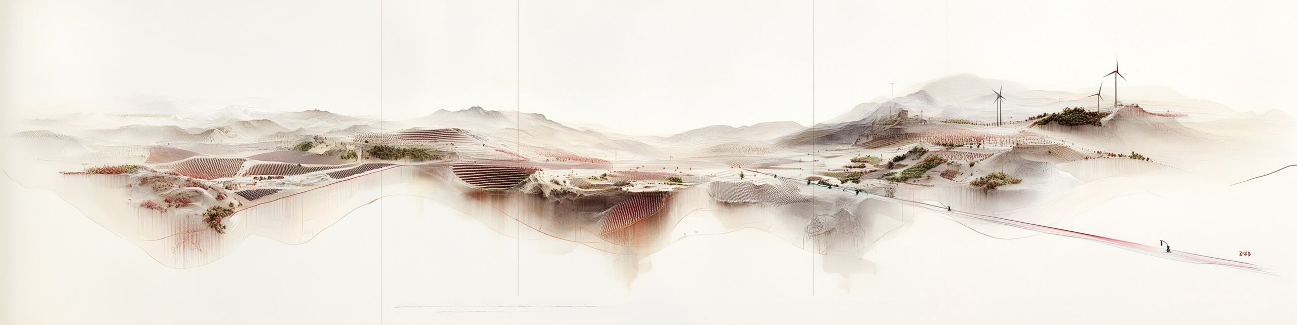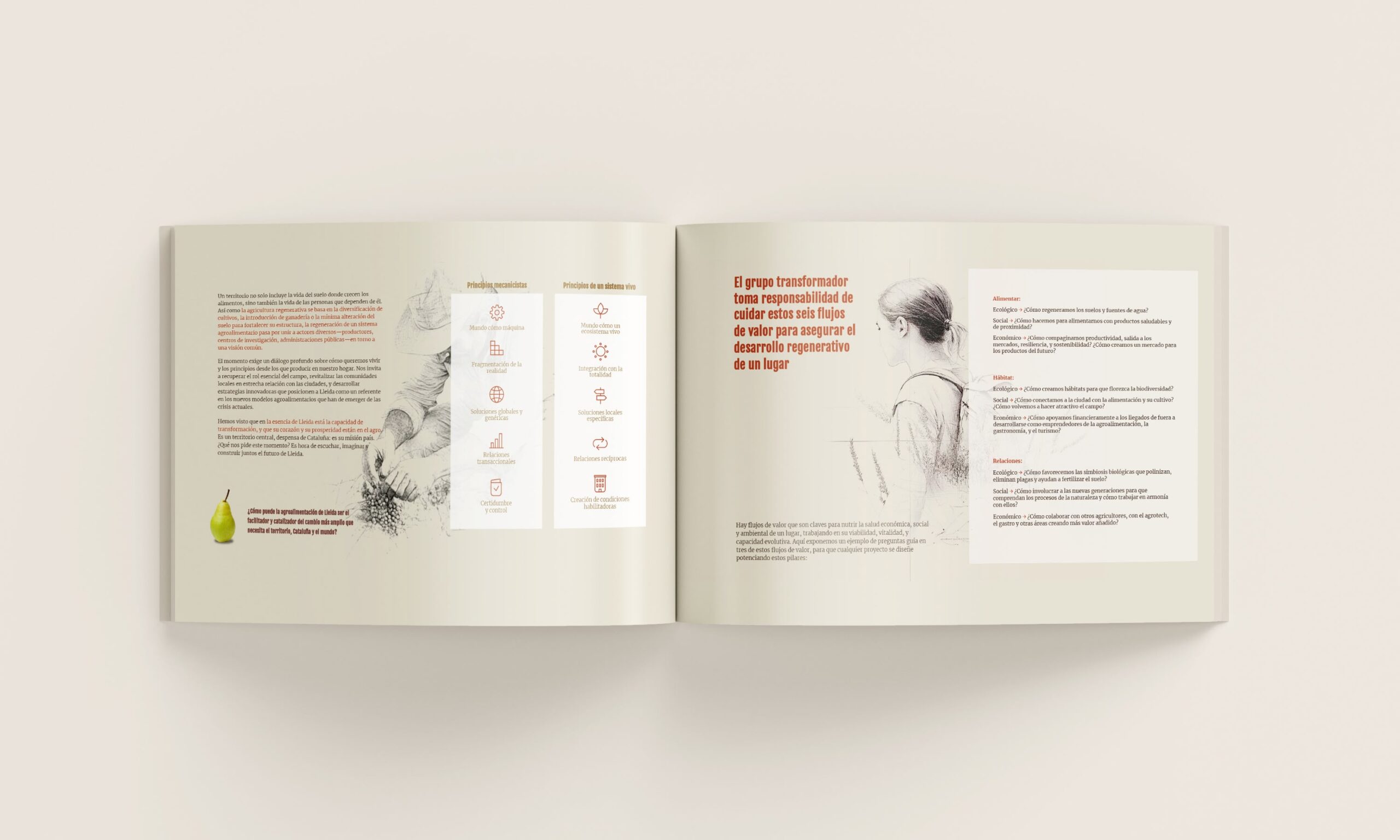 Construimos una narrativa regenerativa: del suelo a la mesa, del dato al paisaje. La dirección de arte mezcla trazo humano y texturas generadas con IA para representar procesos (ciclos hídricos, biodiversidad, cultivo, economía local) y dar una voz visual propia a Lleida Alimenta.